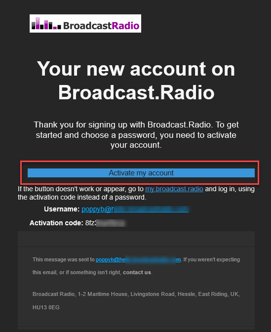 Next check you email. You will have recieved an email from the Broadcast.Radio portal confirming your email address. Click on the Activate My Account button to activate your Broadcast.Radio account.
